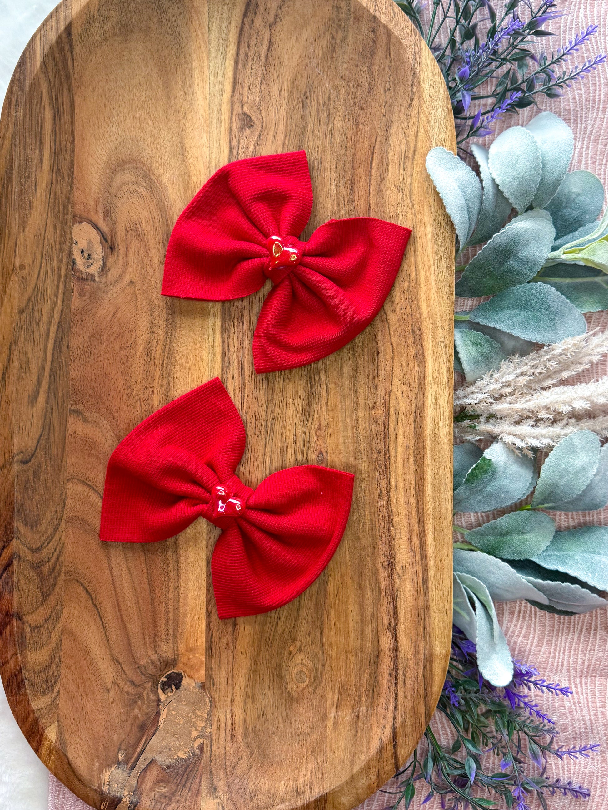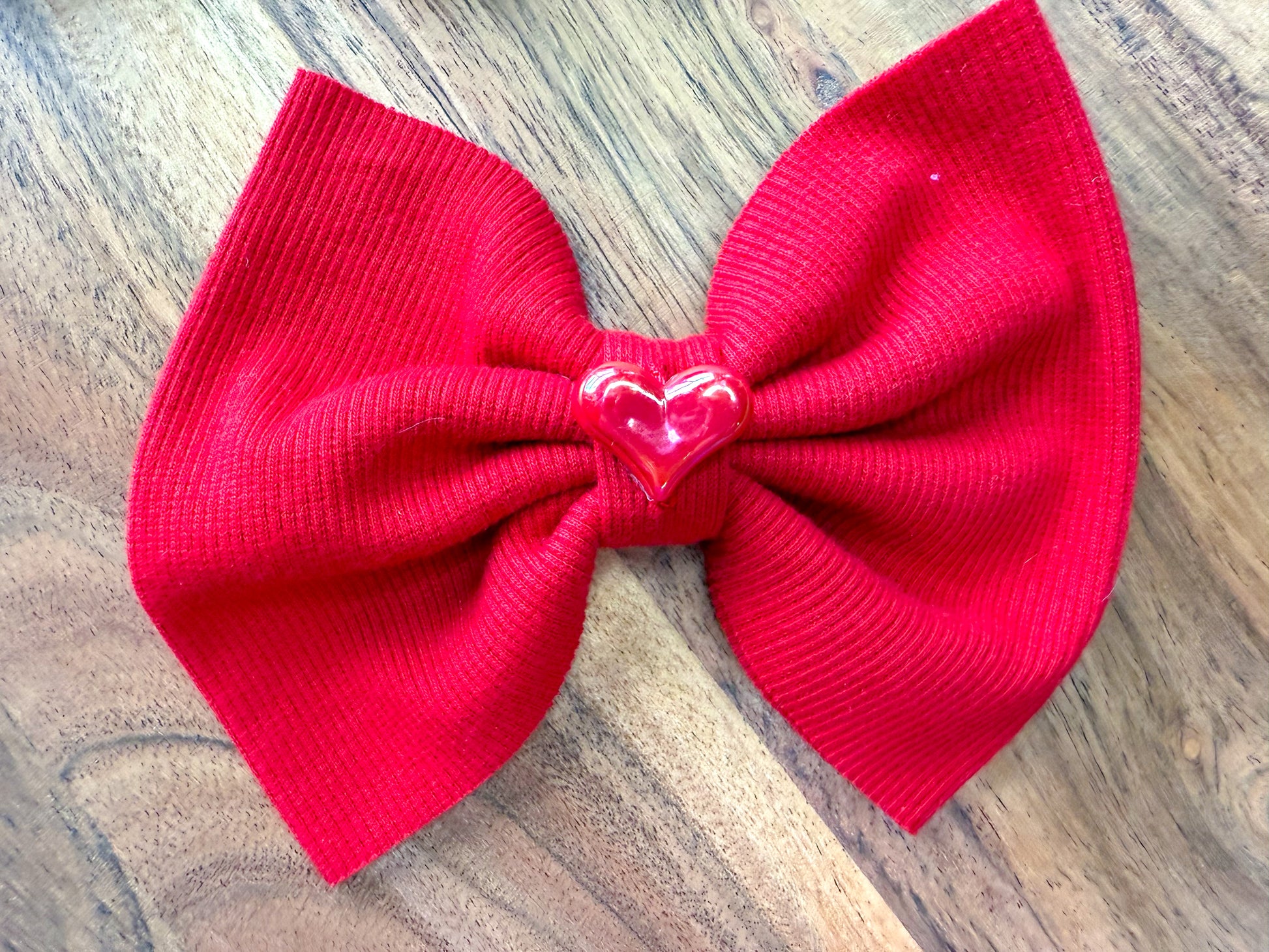 Red ribbed big bow on a clip with a acrylic heart center